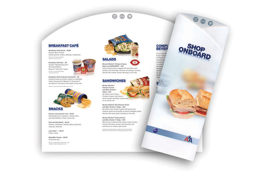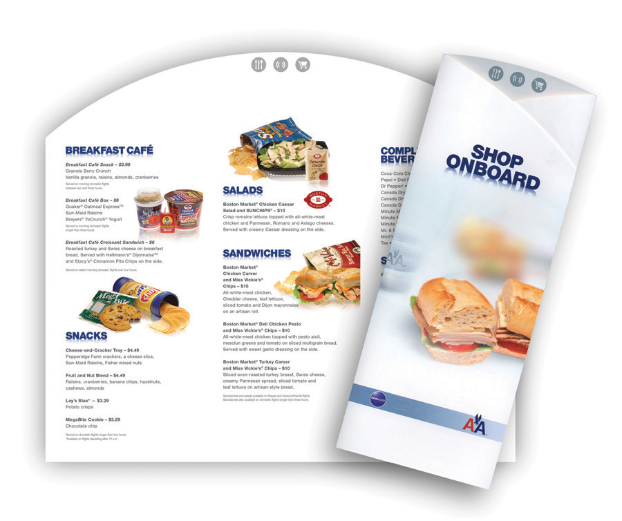 American wanted a complete redesign of the seat back items. I designed the menu to fold over with a rounded top, so it would not be as easily damaged. The design also allowed a passenger to see icons, which provide a preview of what is inside.