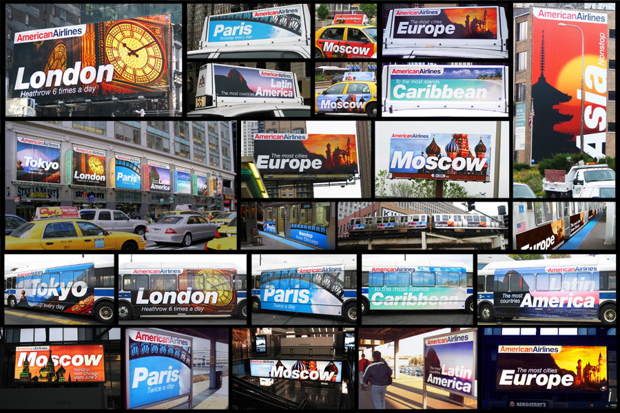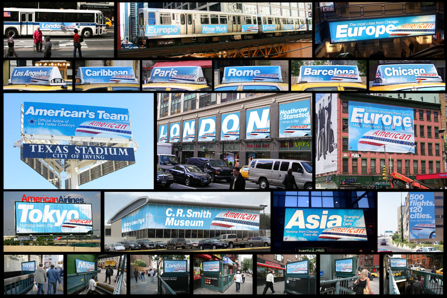 Annually, American would request an advertising takeover in various cities. Each city that was taken over would use ad space for billboards, trains, buses, taxi’s, duratrans, newspapers, and banner ads. The amount of media to be created in a short period was massive. Each theme that was created had its own look and graphic standards, which I would also write and create. This is a brief example of the scope of work for each campaign.